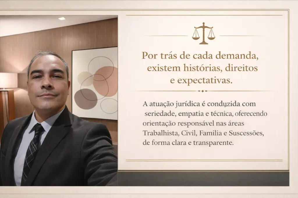 Cada caso é analisado com atenção, responsabilidade e sensibilidade, atuando nas áreas Trabalhista, Civil, Família e Sucessões, sempre com compromisso com a segurança jurídica e a dignidade de quem busca orientação.